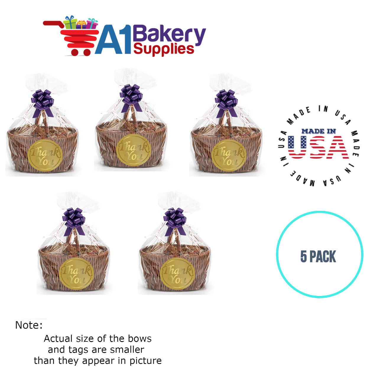 - In this order you will receive 5 purple bows , 5 thank you , 5 gift for you , 5 made with love tag and no gift basket is provided , it is only for the picture purpose and only cellophane bags are selling .