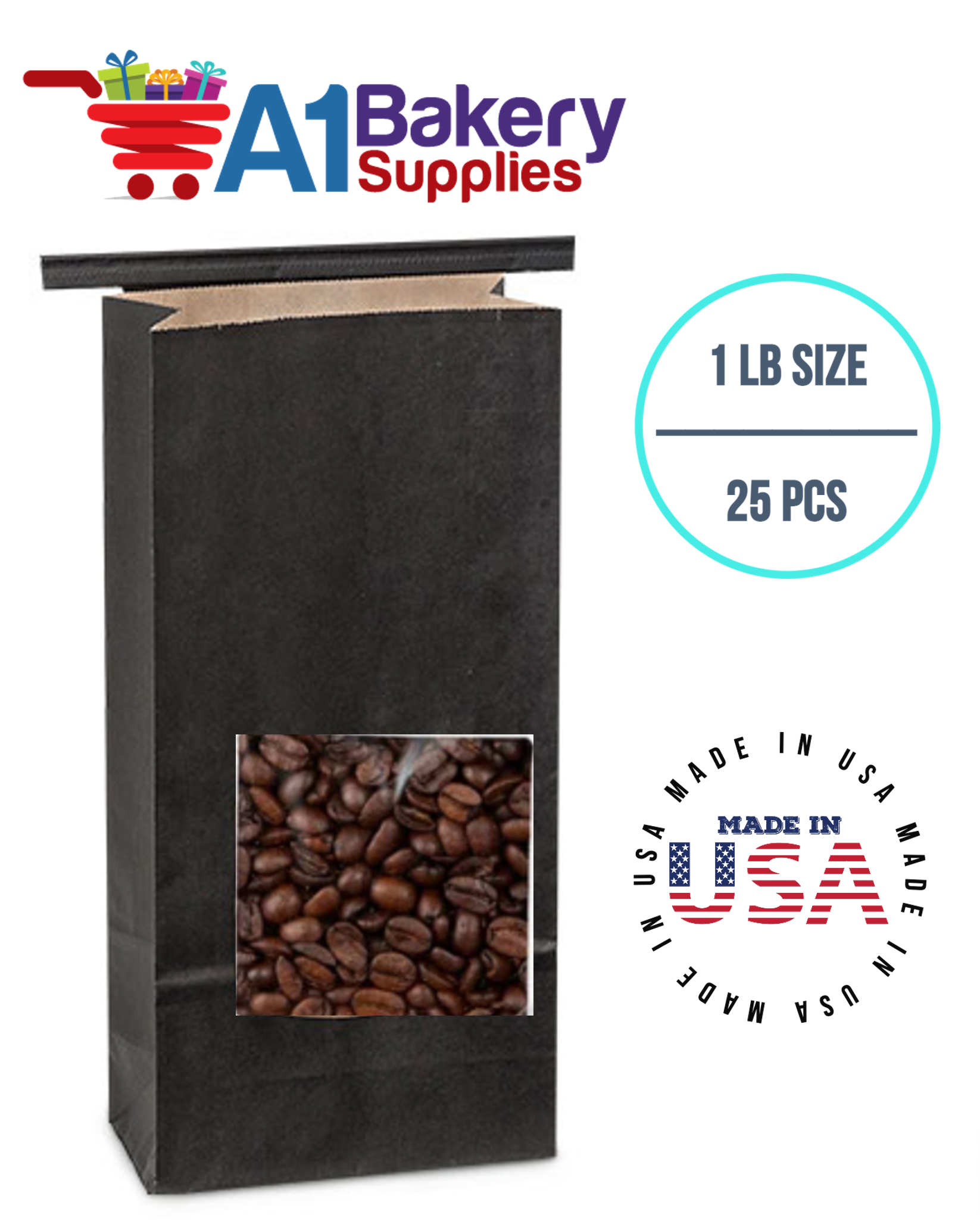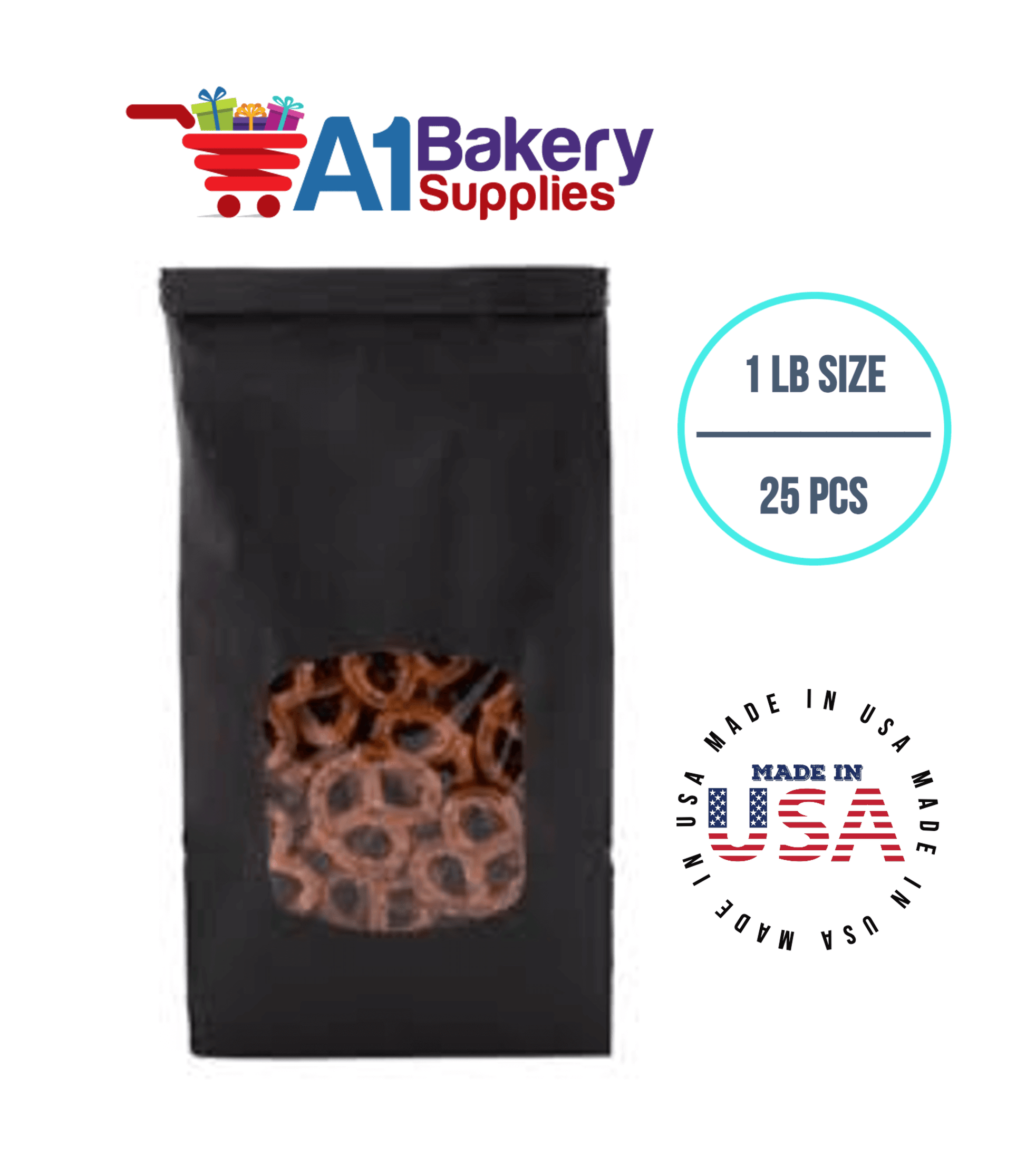 1 LB Tin Tie Bags Black Tin Tie Bags Square Window Tin Tie Bags 25 PCS Bakery Bags with Square Window Resealable Tin Tie Tab Lock Poly-Lined Bags Black Paper Bags for Cookies, Coffee