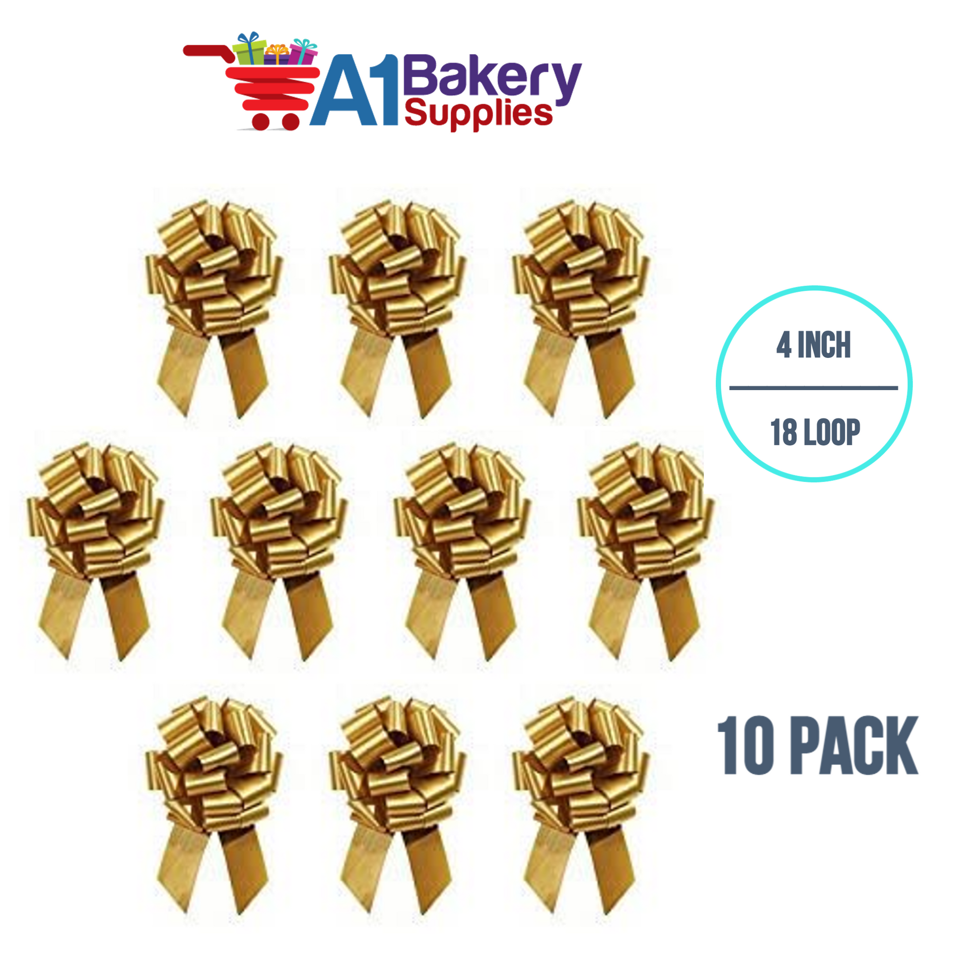 A1BakerySupplies 10 Pieces Pull Bow for Gift Wrapping Gift Bows Pull Bow With Ribbon for Wedding Gift Baskets, 4 Inch 18 Loop in Antique Gold Flora Satin Color