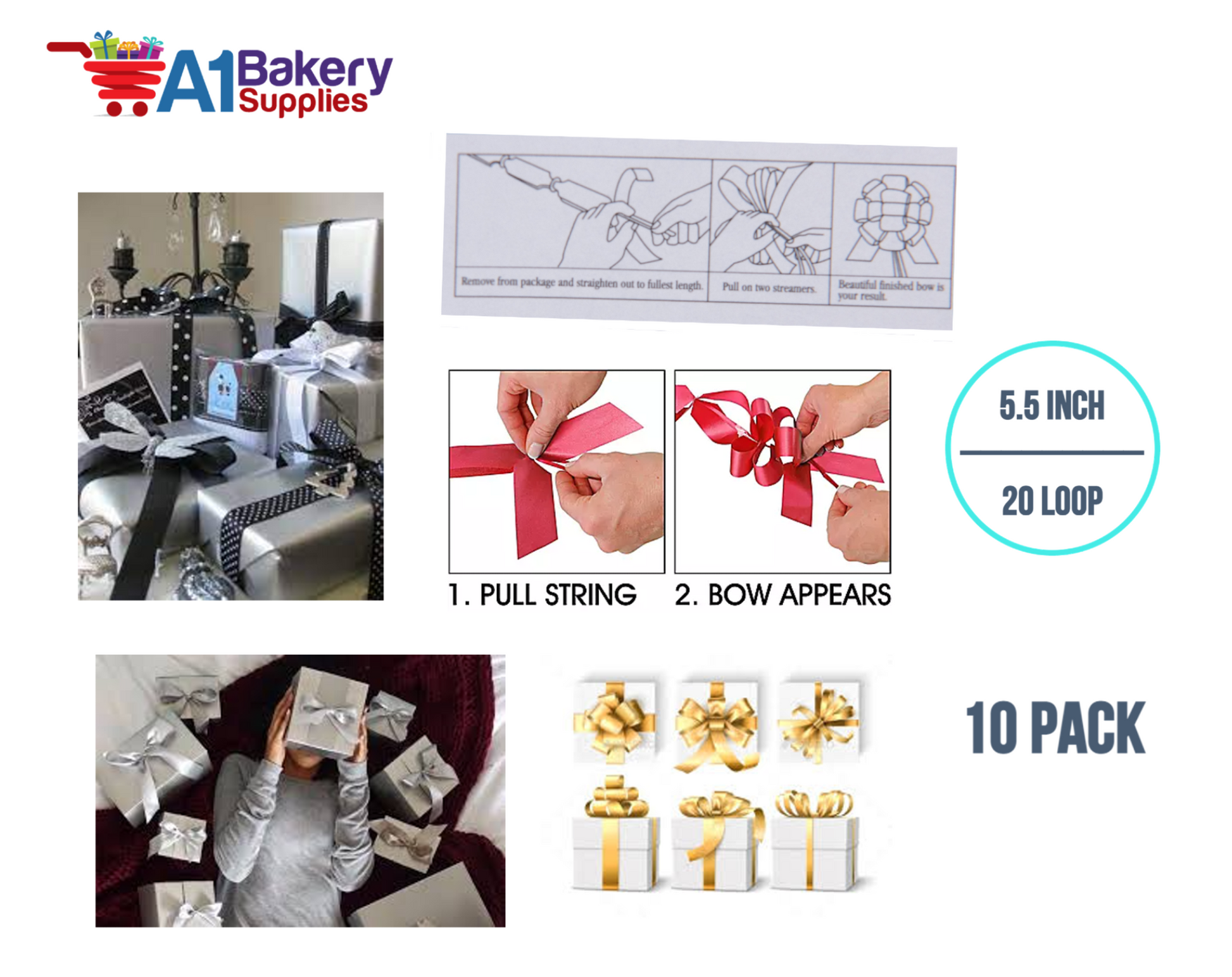 A1BakerySupplies 10 Pieces Pull Bow for Gift Wrapping Gift Bows Pull Bow With Ribbon for Wedding Gift Baskets, 5.5 Inch 20 Loop in Mixed Color