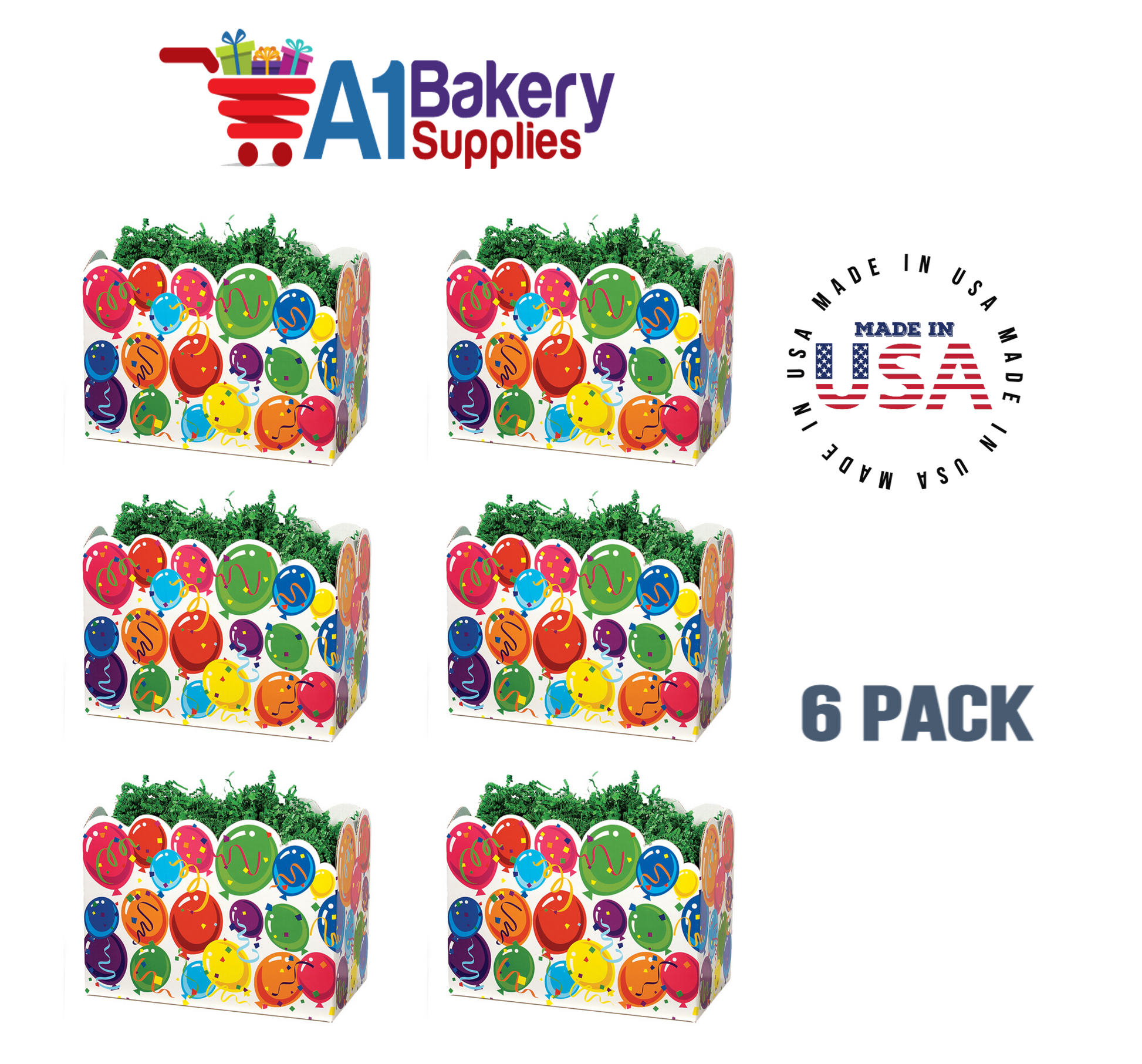 - Large Celebrate Basket Boxes feature colorful balloons on a white background. Features die cut top edge
