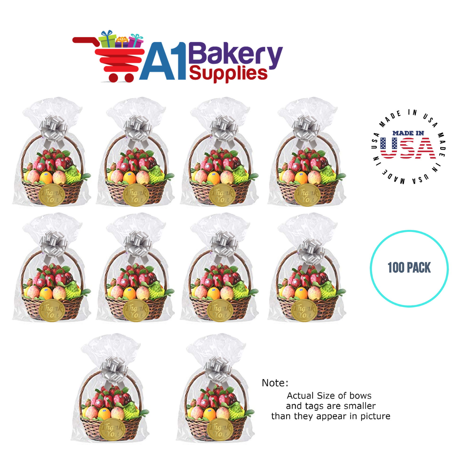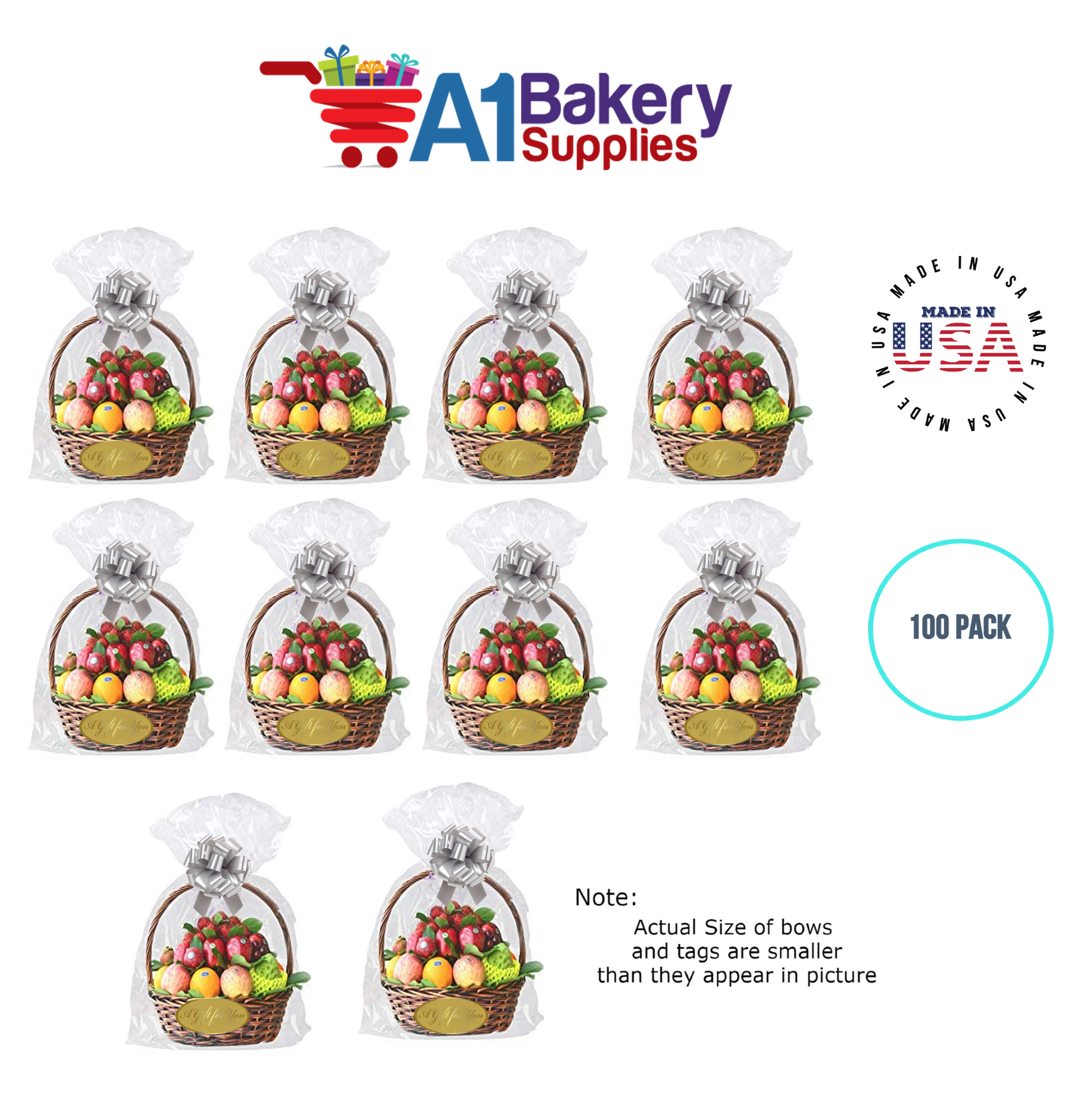 - In this order you will receive 100 Silver bows , 100 thank you , 100 gift for you , 100 made with love tag and no gift basket is provided , it is only for the picture purpose and only cellophane bags are selling .